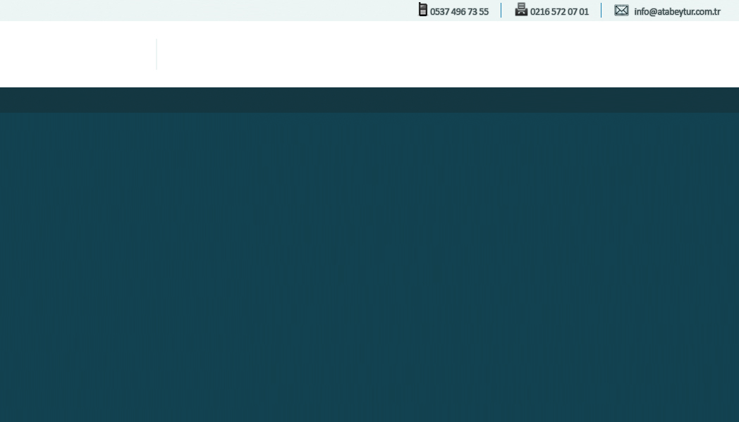 Atabey Turizm fark�yla her t�rl� �zel gezi ve organizasyonlar�n�zda, g�leryiz ve hizmeti bir arada bulabilece�iniz, arkada�lar�n�z ve sevdikleriniz ile birlikte keyifli organizasyonlar yap�p, aksakl�k ya�amadan g�n�birlik gezi ve tur planlar�n�zda yan�n�zday�z.